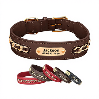 개인 맞춤 레이저 각인 천연 가죽 금색 체인 개 목걸이 소형견부터 대형견까지