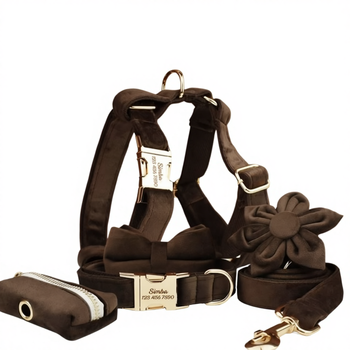 Dây dắt chó kiểu H bằng nhung nâu đậm tùy chỉnh, có đệm nylon, kèm nơ và hoa, túi đựng phân chó khác biệt