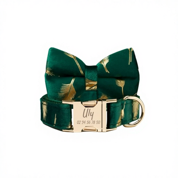 Bộ nơ cá nhân hóa Green Gold Feather dành cho chó con với tên khắc tùy chỉnh, vòng cổ và nơ cho chó đực, quà cưới